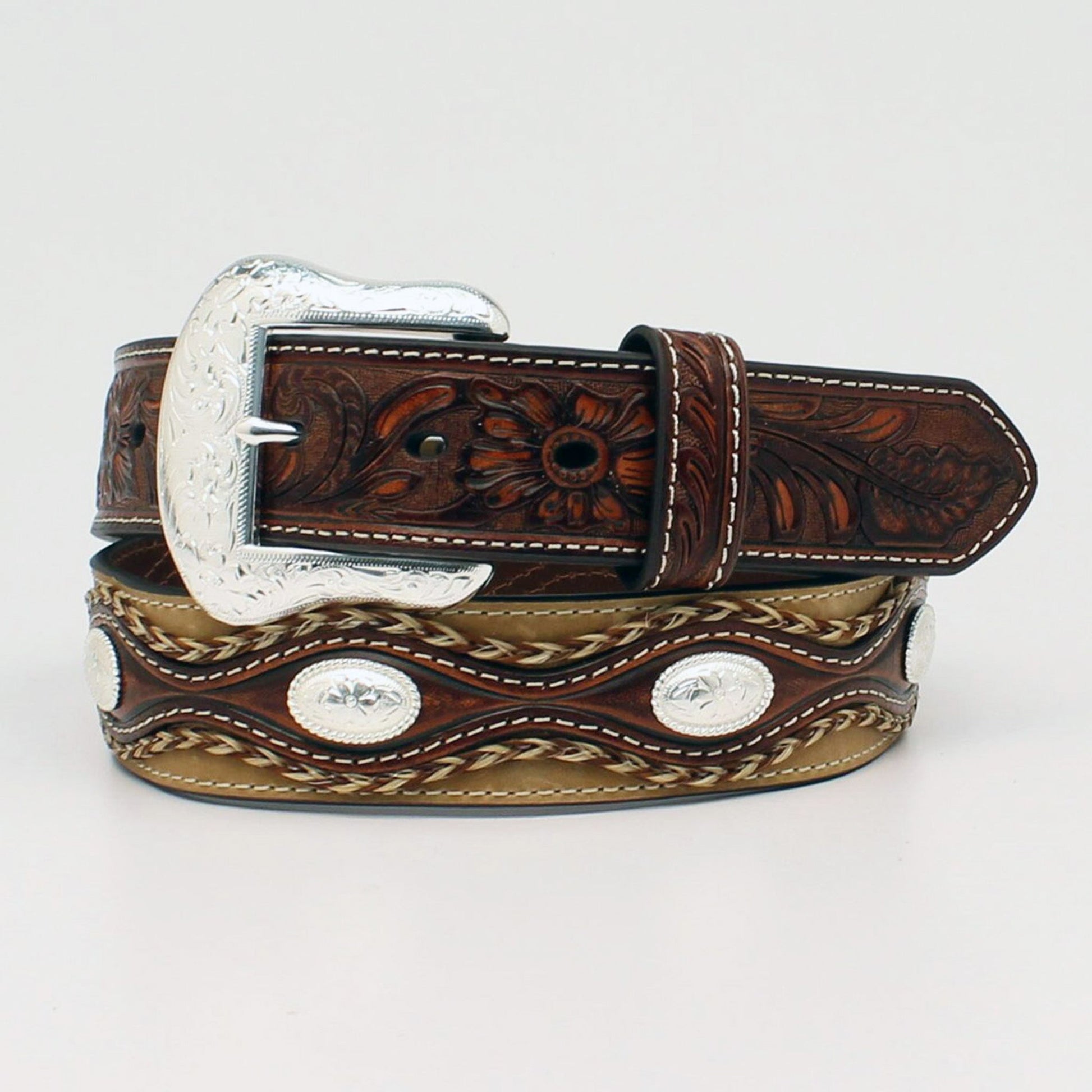 This sharp looking quality Nocona belt by M&F Western Products is made of genuine leather. It has floral embossed tabs and a braided strand around scalloped overlay and is accented with oval conchos.