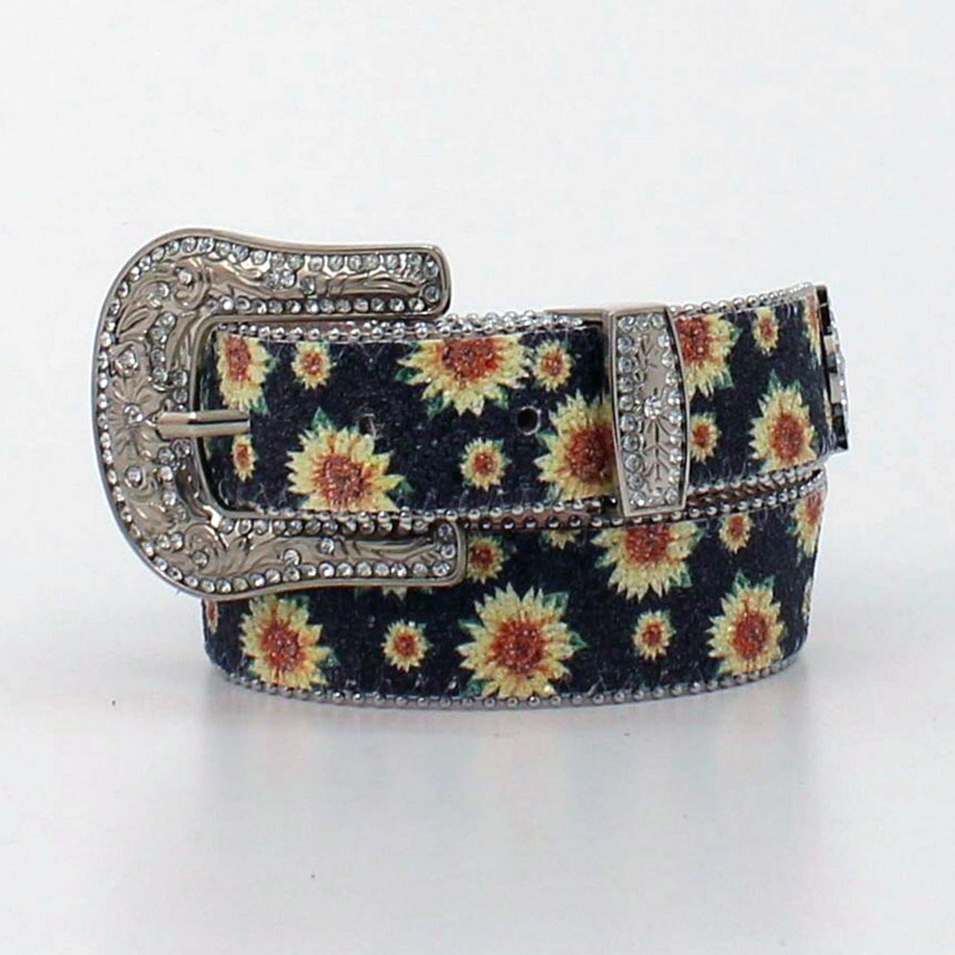 Girl, make a statement with this shimmery sunflower print belt from Angel Ranch. It features clear stones in the buckle and tip of the belt, the buckle is removeable!