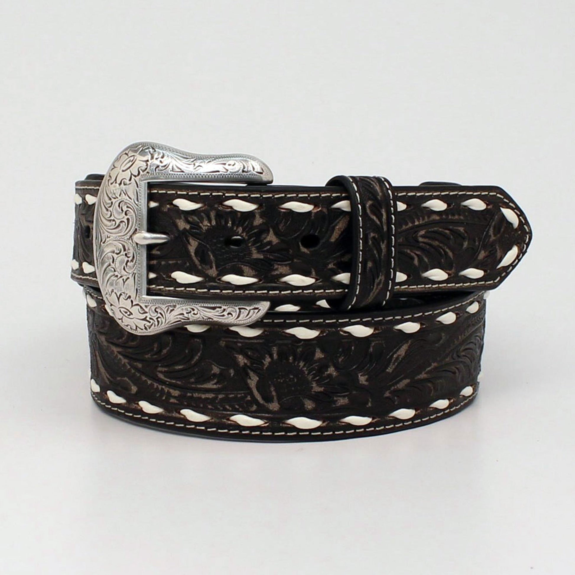 This quality men’s Nocona belt by M&F Western Products is made of genuine leather. It has a black distressed floral tooled belt with white lacing, and a removable silver buckle.